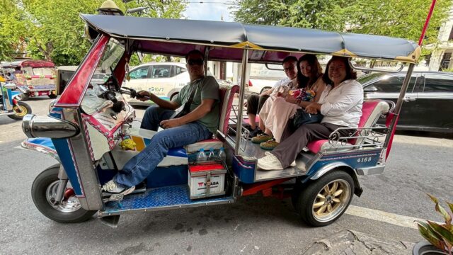 タイ名物トゥクトゥクに乗って、船着き場まで移動します。移動そのものが思い出になる、タイ旅行ならではの体験です。