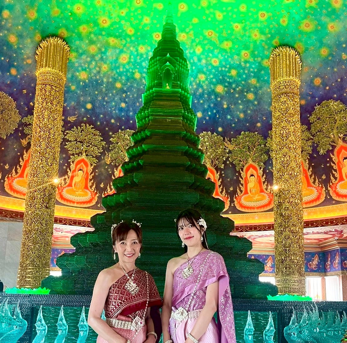 一度ロングテールボートから降りて、ワットパクナムへ。エメラルドグリーンに輝く仏塔や天井一面に描かれた幻想的な仏教画は、まるで別世界に入り込んだかのような美しさです。
